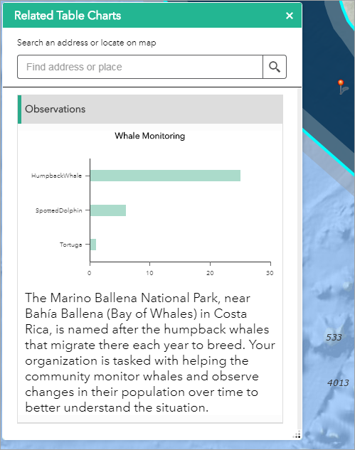 The Related Table Charts widget allows you to chart (bar, pie, or polar chart) values from a related table of a feature layer.